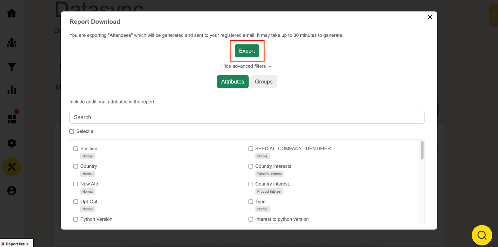Download the Attendees' and Companies’ data pulled from API by clicking "Download Data". You can filter per group to segment your report even more by selecting the specific groups:
