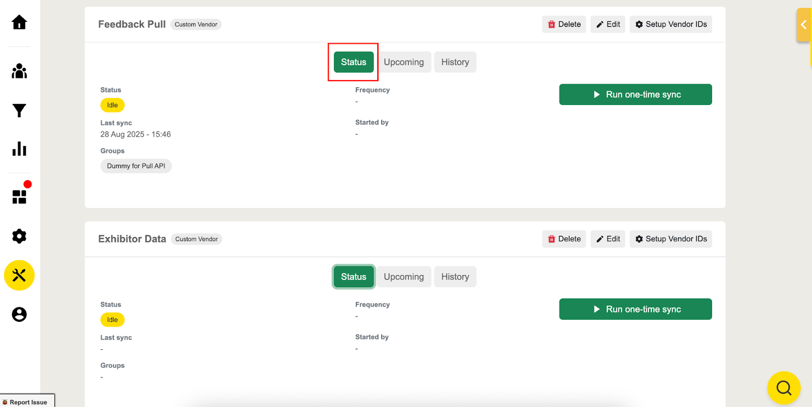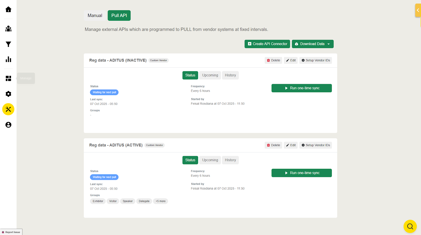 If you opted for Agenda API for your event you will also have the same options as in Attendees; you must select the Pull frequency from the drop-down list and review the Status, Last Successful, Started by, and Groups of the Syncs: