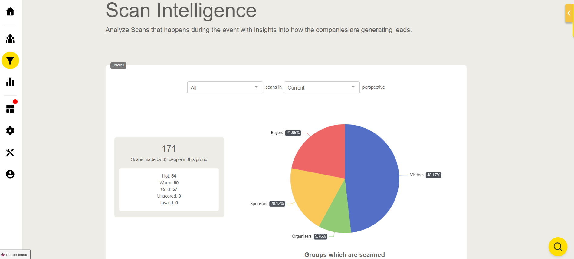 The main dashboard gives you an overview of the volume and distribution of scans during the event. This data is categorized by Lead Types and Scanned Groups, providing a clear representation of attendee engagement.