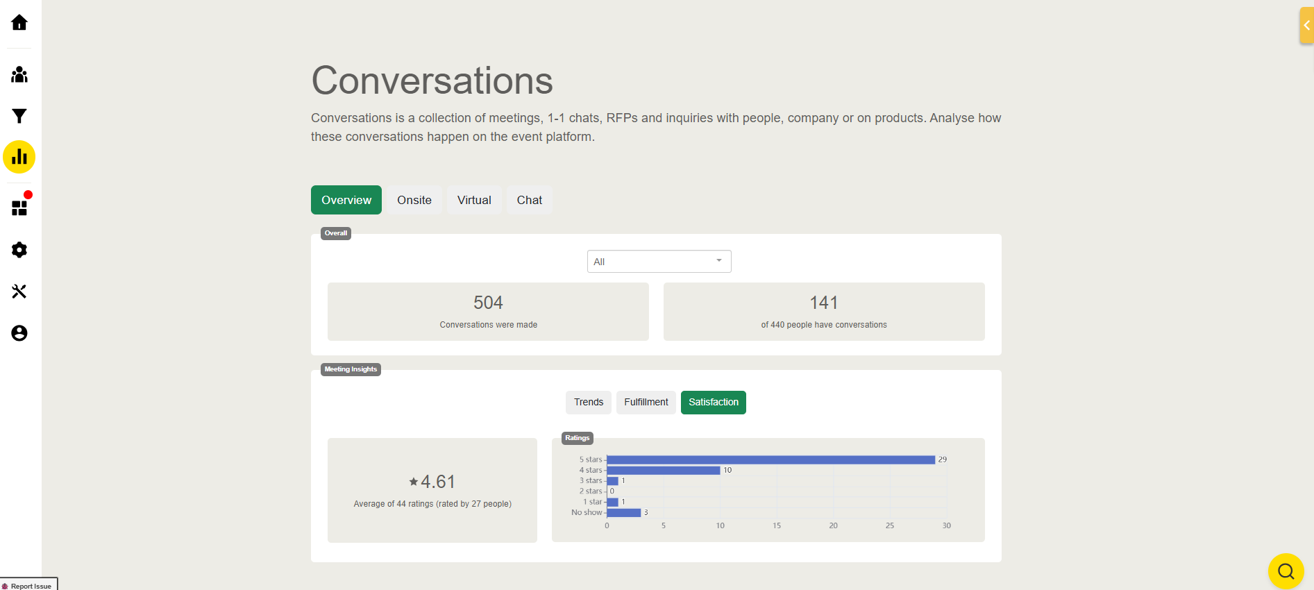 Under the 'Satisfaction' tab, you'll gain insights into users' satisfaction with meetings. This tab provides a detailed breakdown, including: