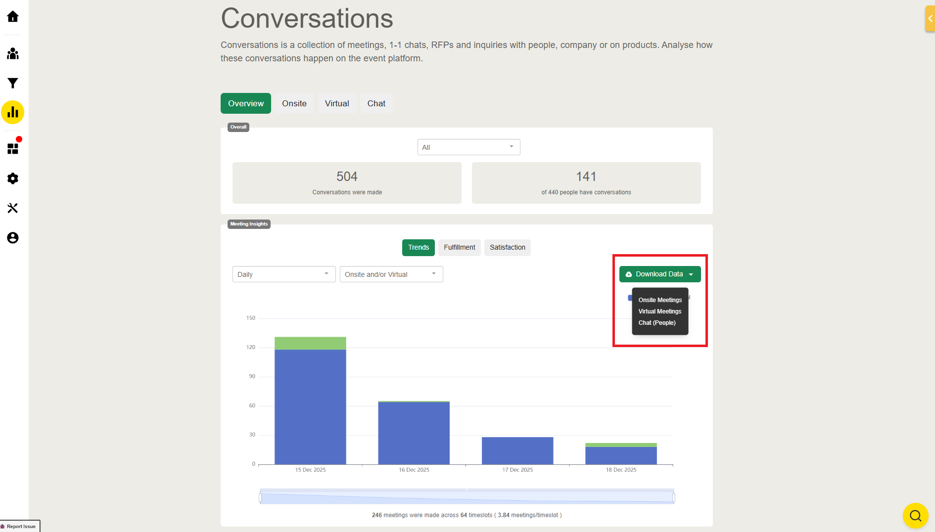 - Shows charts detailing the number of meetings in daily and timeslot format