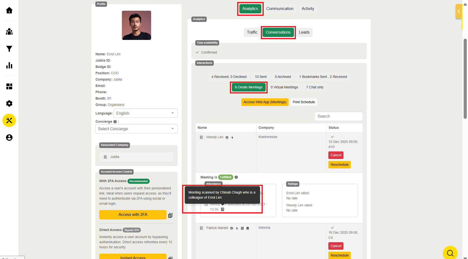 The following tools ensure precise tracking of meeting participation, with attendance recorded through scan logs and meeting ratings submitted via the platform. The Scan feature logs when attendees interact with company representatives, while the Rating functionality provides valuable insights into attendee engagement during meetings. Together, these features offer a comprehensive and accurate record of meeting attendance.