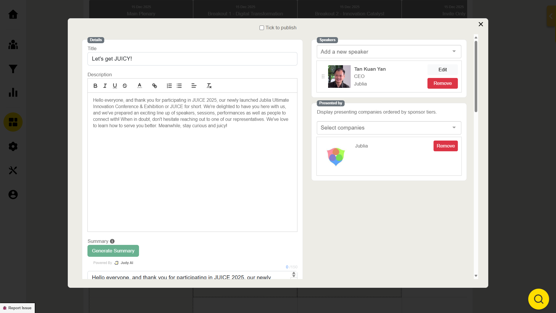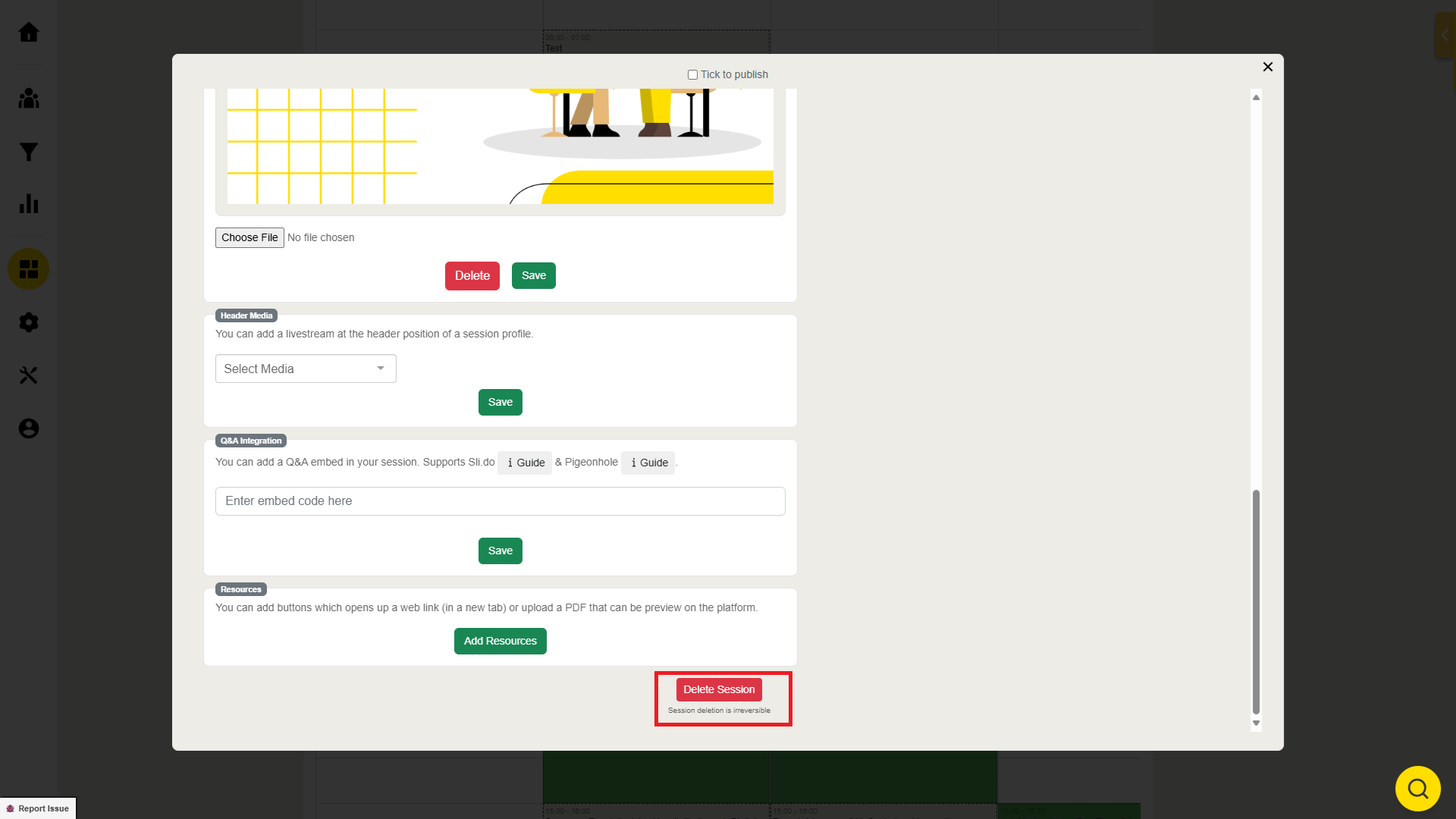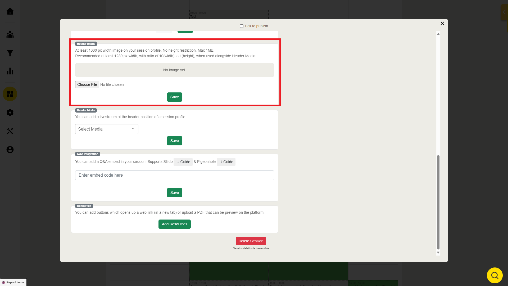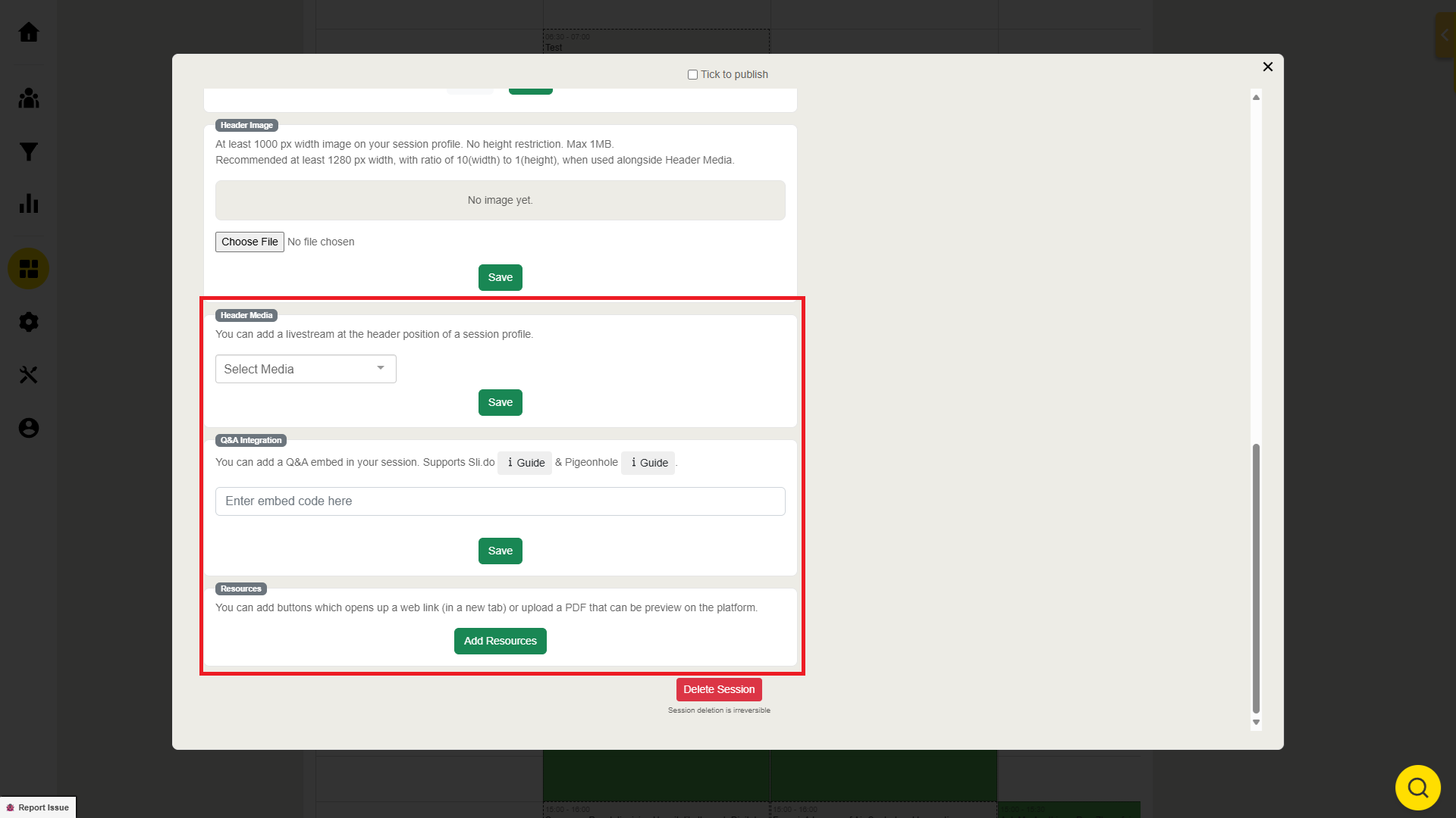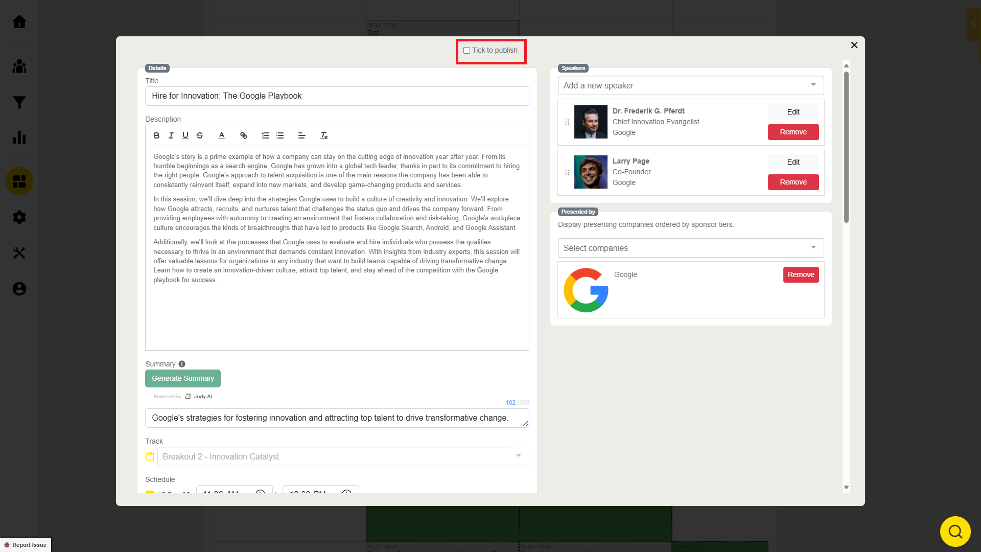 Once all the session details are filled in, tick the box "Tick to publish" to make the session visible in the agenda menu.