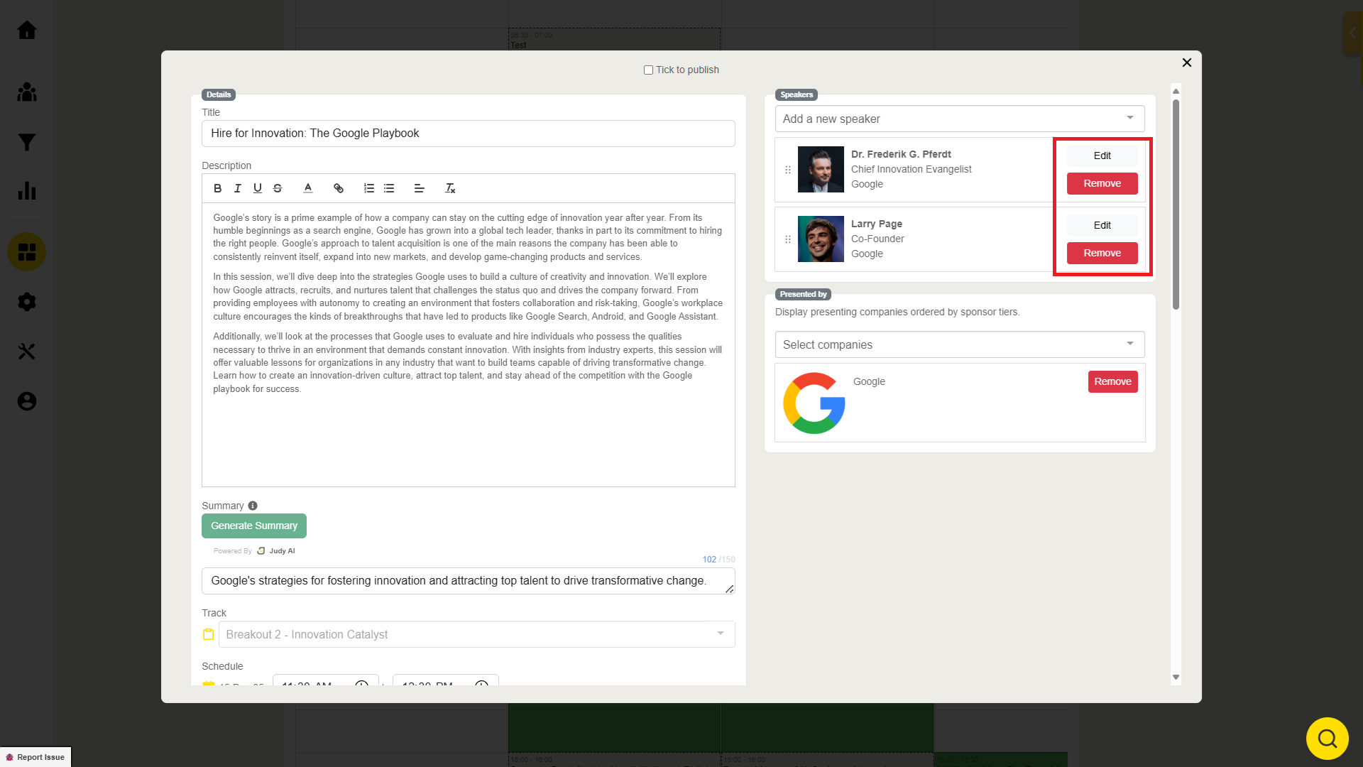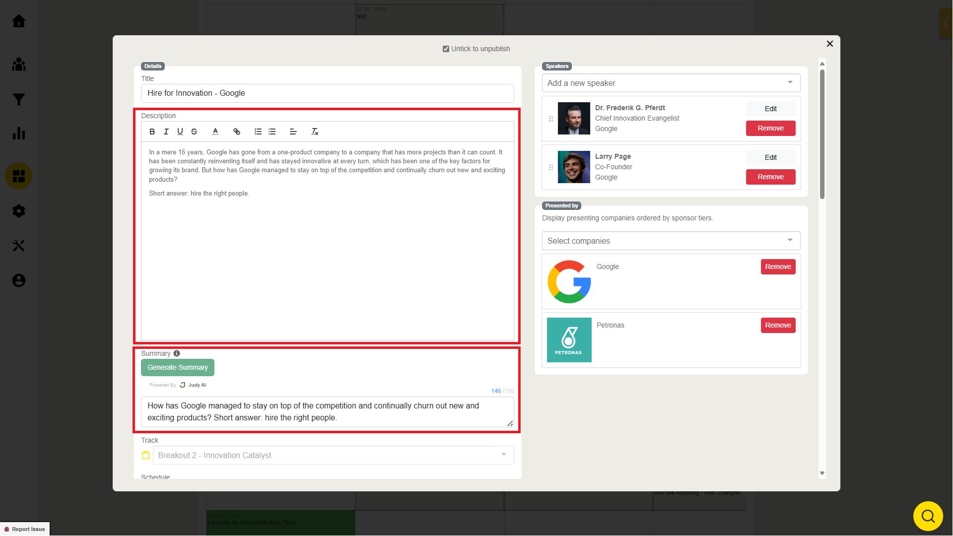 - Write a concise summary (up to 150 characters) that will appear as a preview in the agenda.