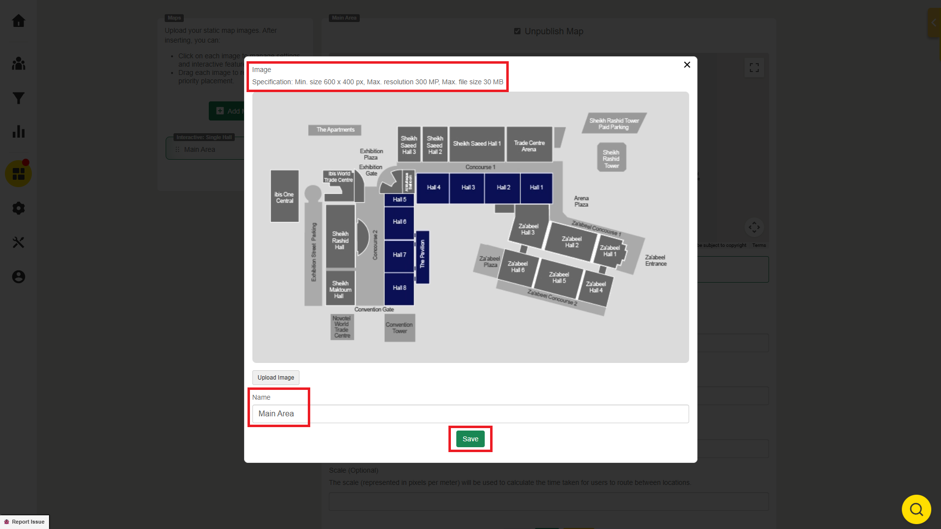 - Click the green “Add Map” button to upload the floor plan to the platform. Please upload the image in the format of png, jpg, or jpeg.